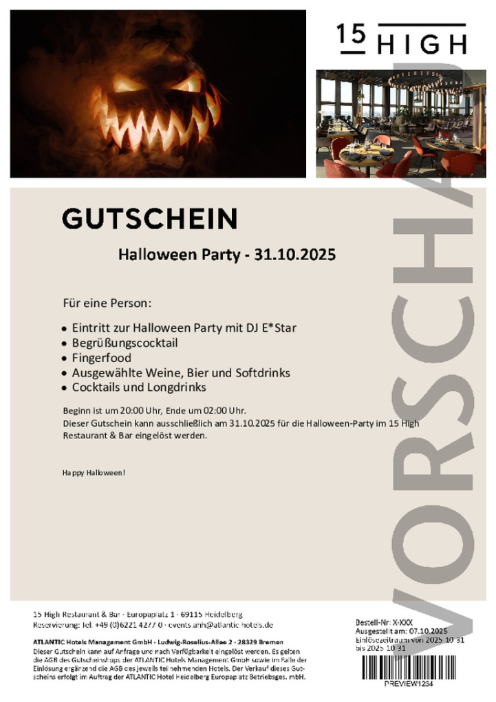 Happy Halloween! Schaurig schönes Partyvergnügen im 15 High. DJ E☆Star sorgt für Beats & Glamour - und die ausgefallensten Kostüme prämieren wir mit tollen Preisen! Von 20:00 Uhr bis 02:00 Uhr. Das Ticket beinhaltet: