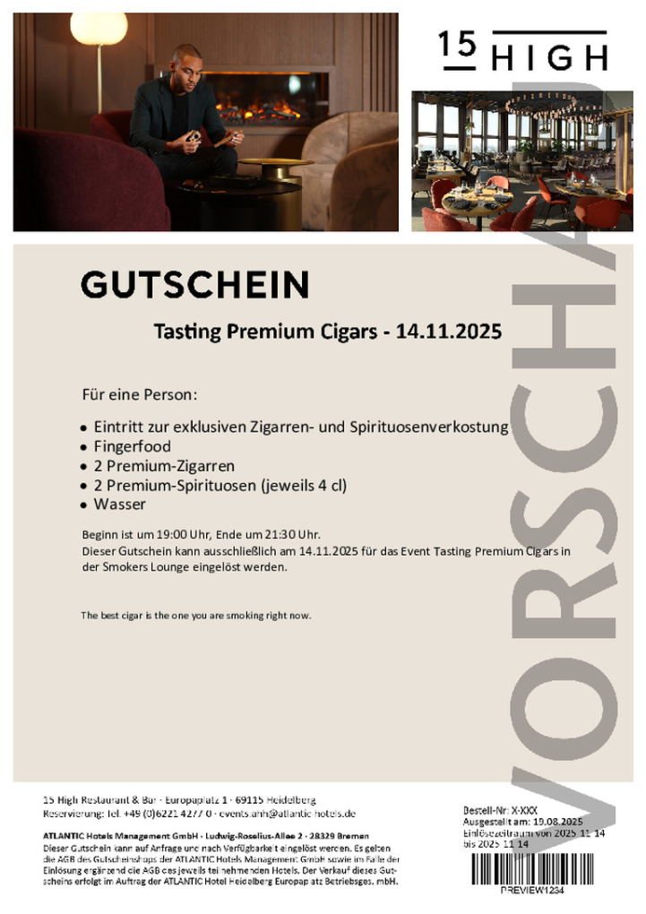 Genussvolle Momente mit Don Peppone Erleben Sie einen Abend voller Luxus und Genuss. Erlesene Zigarren, begleitet von feinen Spirituosen und kulinarischen Köstlichkeiten. Von 19:00 Uhr bis 21:30 Uhr. Das Ticket beinhaltet: